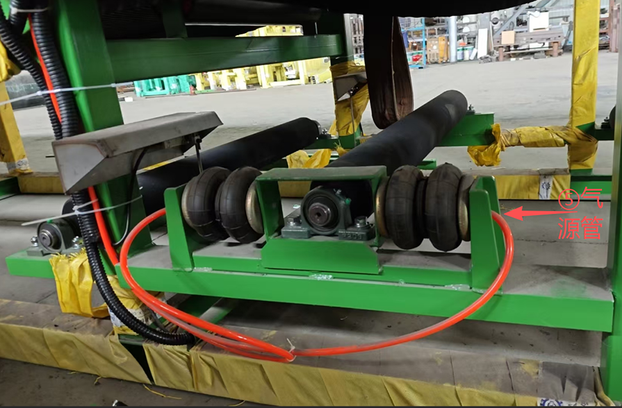 在正常運(yùn)轉(zhuǎn)中,濾布是不會(huì)碰到糾偏裝置的檢測(cè)桿。當(dāng)濾布跑偏時(shí),濾布會(huì)碰到檢測(cè)桿,檢測(cè)桿偏移,自動(dòng)糾偏裝置中的氣囊會(huì)一側(cè)充氣,一側(cè)放氣,帶動(dòng)糾偏輥蛇形偏移,使濾布改變偏移方向,恢復(fù)到正常運(yùn)轉(zhuǎn)軌跡。