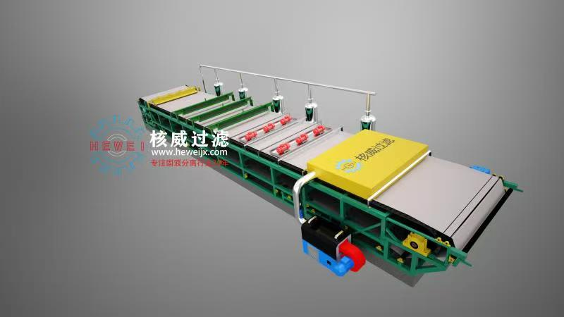 真空帶式過濾機以環(huán)形過濾帶為介質(zhì),通過真空系統(tǒng)產(chǎn)生負(fù)壓實現(xiàn)固液分離,整個過程分為漿料分布、真空過濾、清洗提純、自動卸料四個連續(xù)階段,完美適配膨潤土漿料的處理需求。首先,經(jīng)提純或鈉化改性后的膨潤土漿料通過進(jìn)料裝置均勻分布在運行的過濾帶上,進(jìn)料裝置的攪拌機構(gòu)可防止固體顆粒沉降,避免局部濾層過厚或過薄影響分離效果;隨后濾帶攜帶漿料進(jìn)入真空吸濾區(qū),真空盒產(chǎn)生的-0.04~-0.08MPa負(fù)壓將漿料中的液體快速抽離,膨潤土顆粒被濾帶截留形成連續(xù)濾餅,通過多段真空室梯度調(diào)壓,實現(xiàn)前端快速脫水、后端深層脫水的效果;若需提升產(chǎn)品純度,清洗區(qū)的噴淋裝置可噴灑清水或?qū)S孟礈靹?,去除濾餅表面殘留的可溶性雜質(zhì),洗滌液單獨收集避免交叉污染;最后濾帶運行至卸料區(qū),通過卸料輥張力變化和彈性刮刀完成自動卸料,清潔后的濾帶循環(huán)進(jìn)入下一輪作業(yè),實現(xiàn)24小時連續(xù)運行。